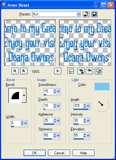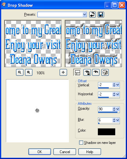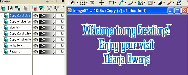 Now duplicate your background layer twice and merge each font layer with a background layer. Finished psp image should have 3 layers, then save and animate in animation shop. Save as FontTutDeanaOwens.gif. Please put your name where my name is and post me this only.